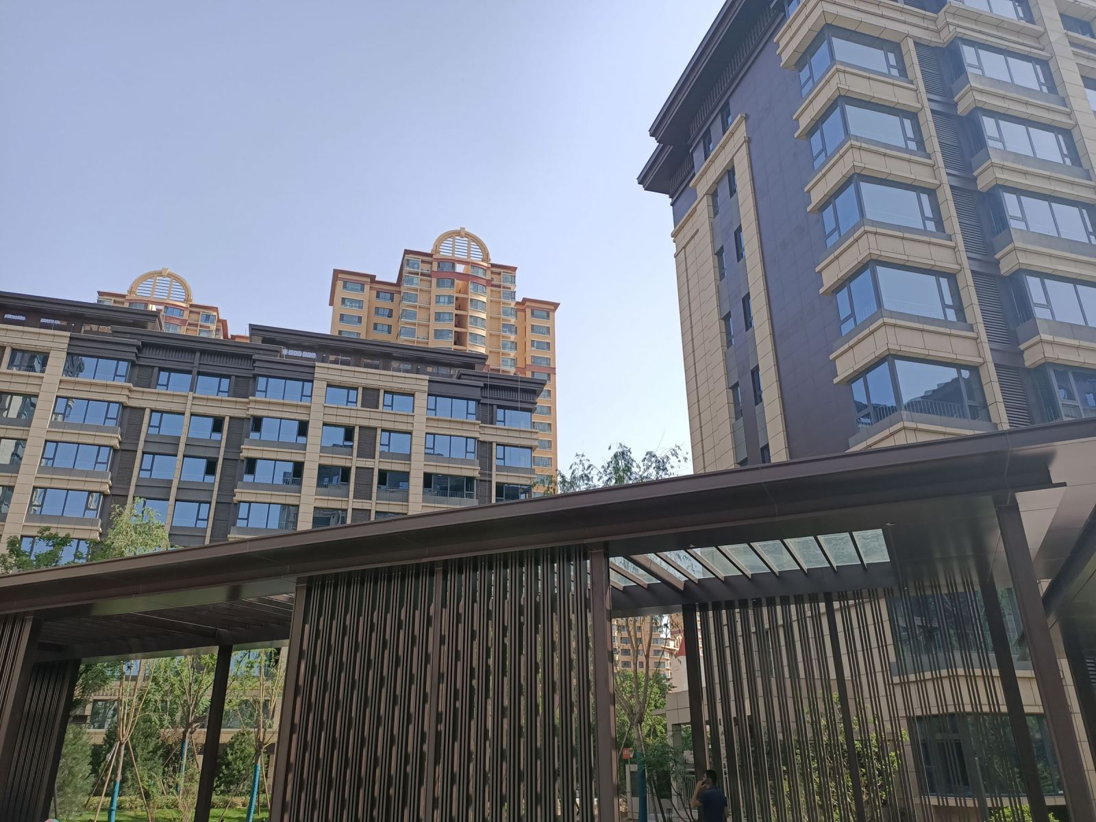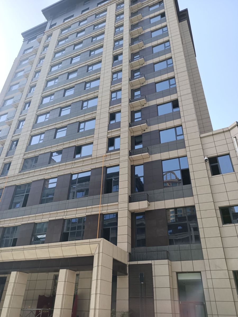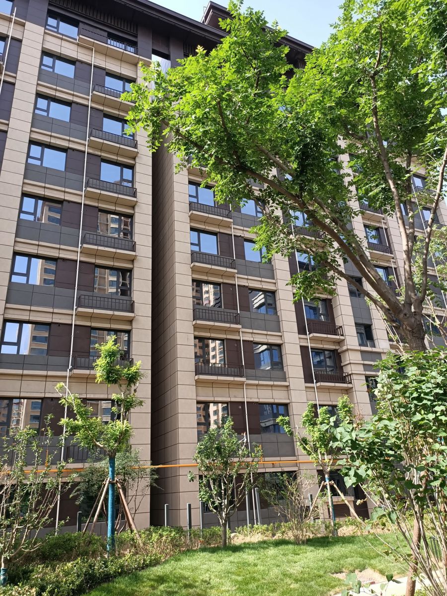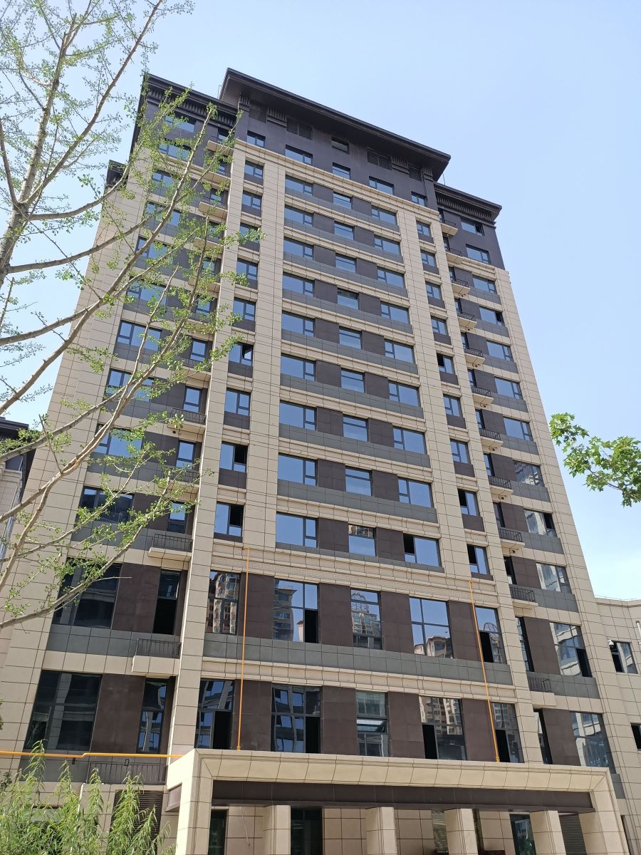 建筑外墻使用咖色、芝麻黑、黃金麻陶瓷保溫一體板搭配鋪貼,共6萬多平方。