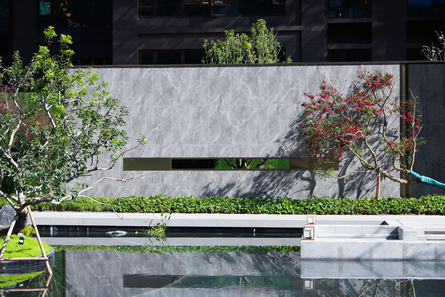 景墻使用600*1200希臘灰產(chǎn)品干掛鋪裝,