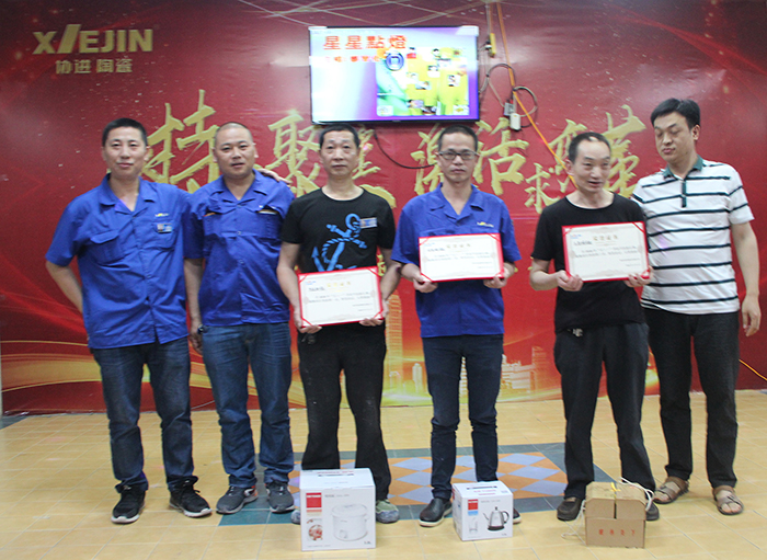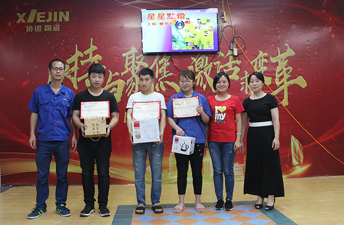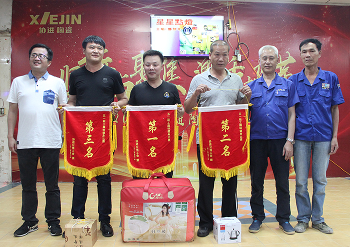 晚會首先由馮先祿副總經(jīng)理宣讀《關(guān)于表彰慶祝2018年五一國際勞動節(jié)活動比賽優(yōu)勝者(團(tuán)隊)的決定》。制造三課陳廷相、制造六課何金槍、制造五課王昌明等施釉技能比賽優(yōu)勝者;技術(shù)部楊永祥、吳林艷、張俊等對樣技能比賽優(yōu)勝者,以及制造三課代表隊、制造一部和品保部代表隊、倉儲課和行政后勤代表隊等4支趣味健身比賽優(yōu)勝團(tuán)隊代表上臺接受公司領(lǐng)導(dǎo)的表彰。