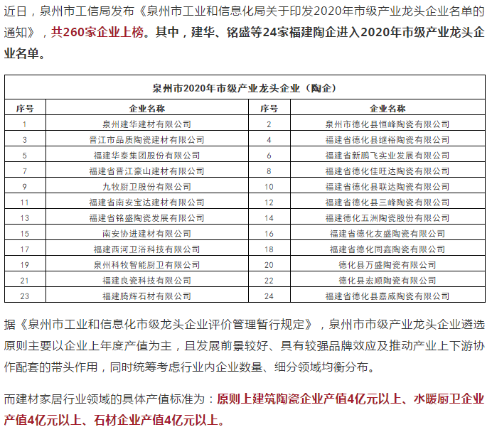 恭喜南安協(xié)進建材有限公司入選泉州市工信局發(fā)布“2020年市級產(chǎn)業(yè)龍頭企業(yè)”。