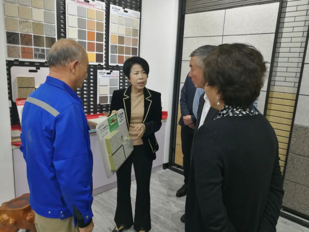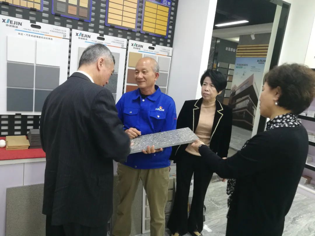 繆會長一行在王家助董事長、楊寶貴副董事長、王少華總經(jīng)理的介紹下饒有興趣地參觀了產品展廳,對協(xié)進研發(fā)生產的一系列大規(guī)格薄板、大板、陶瓷薄板復合保溫一體板、地鋪石等綠色節(jié)能新產品,以及諸多產品在泛家居領域的創(chuàng)新與運用給予肯定,并提出寶貴意見。